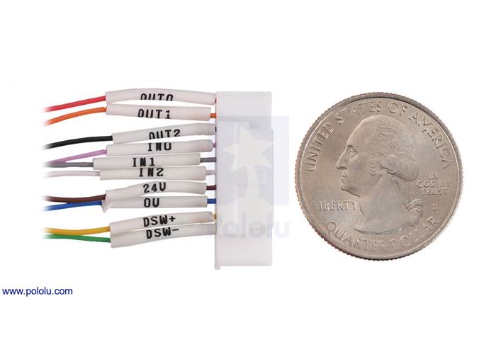 The grippers have a 200 cm (80″) cable with ten conductors terminating in a 12-pin, 2mm-pitch A2008H-12P connector. RobustMotion recommends cutting the connector off and using the individual wires. Note: pins 9 and 10 (DSW+/-) are not used on this version of the gripper.