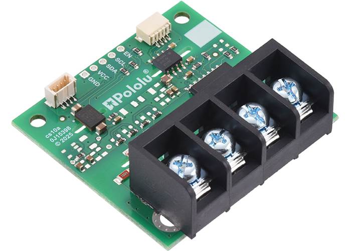 This board is an integrated solution for monitoring voltage, current, power, and other parameters in AC and DC systems featuring Allegro’s ACS37800KMACTR-030B3-I2C isolated power monitoring IC. It provides bidirectional current measurements from −30 A to +30 A and can be configured to measure voltages up to 480 VRMS nominal (up to ±980 V peak). Our carrier board adds secondary isolation to the sensor’s I²C interface for additional safety and measurement accuracy. This version has a soldered Amphenol YK4410403000G terminal block rated up to 300 V.