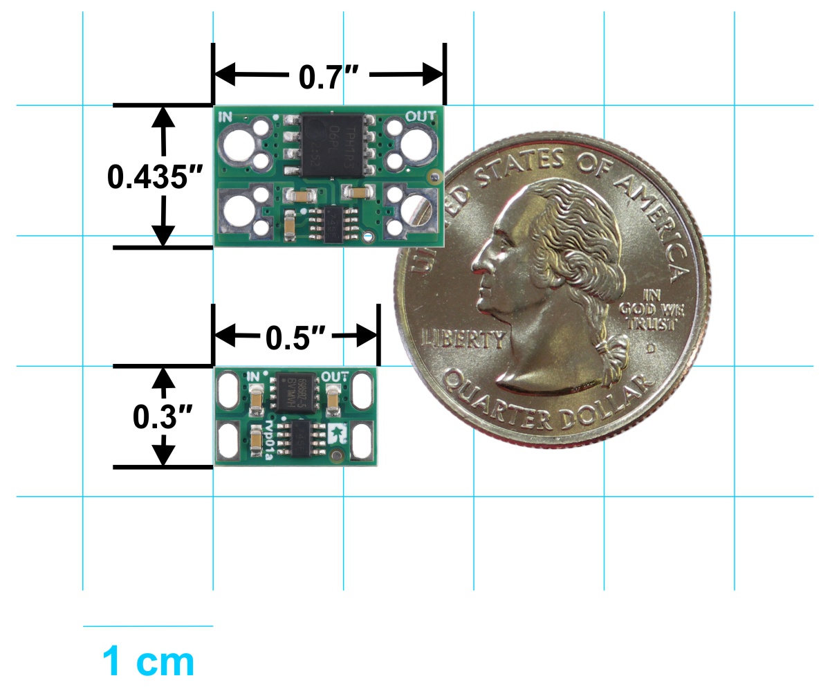 | Reverse voltage protection only | 10 A | < 10 mΩ | 0.3″×0.5″ | $3.29 | #5380 |