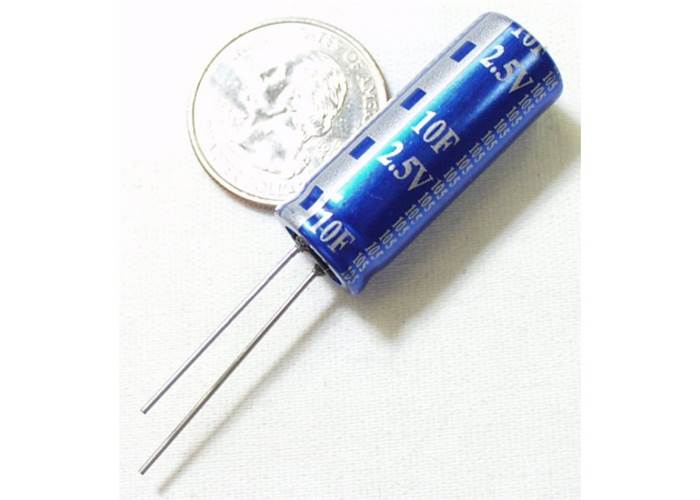 Yes you read that correctly - 10Farad capacitor. This small cap can be charged up and then slowly dissipated running an entire system for hours. Combine two in series for 5F/5V. Do not over voltage or reverse polarize these capacitors.