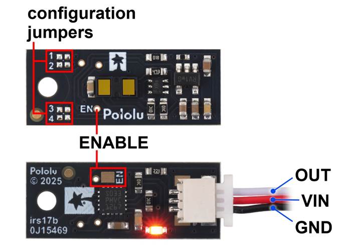 Three connections are necessary to use this module: VIN, GND, and OUT. These pins are accessible through the board’s 3-pin male JST SH-style connector, which is compatible with our 3-pin JST SH-style cables. When used with our cables, the red wire connects to VIN, the black wire connects to GND, and the white wire connects to OUT. The VIN pin should be connected to a 3 V to 5.5 V source, and GND should be connected to 0 volts. The OUT pin drives low (0 V) when an object is being detected and it drives high (to the VIN level) when an object is not being detected. It is weakly pulled high when the sensor is disabled or waiting for its first reading to complete after power-up. A red LED on the back side of the board also lights whenever an object is detected.