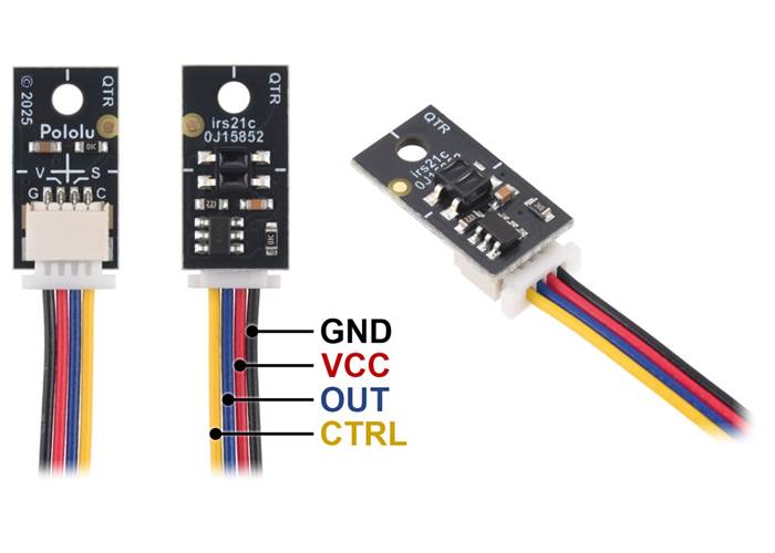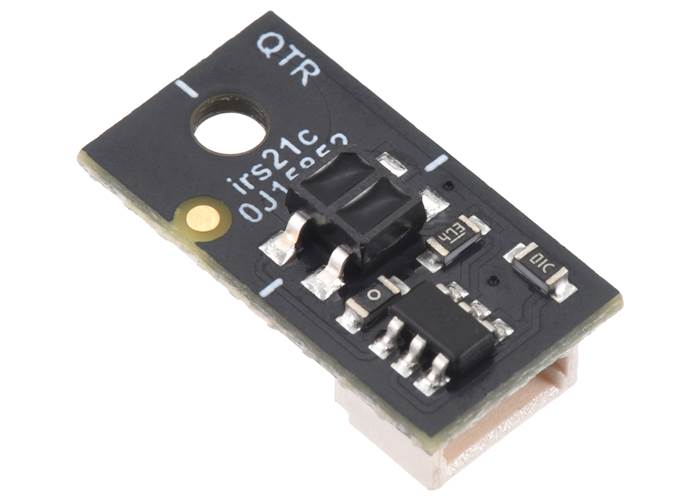 This sensor uses an IR LED and a phototransistor to measure the light reflected from nearby surfaces. It operates from 2.9–5.5 V, with dimmable brightness control independent of the supply voltage. The optimal range is <5 mm, but it can detect high-reflectance objects out to around 30 mm. This version features a traditional-style QTR sensor without lenses and a connector that works with our 4-pin JST SH-style cables (compatible with SparkFun’s Qwiic and Adafruit’s STEMMA QT cables, but the interface is not I²C).