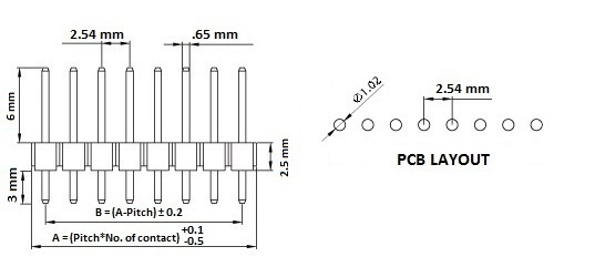 Dimension diagram of 0.100" (2.54 mm) breakaway male header, straight, double-sided, single-row.