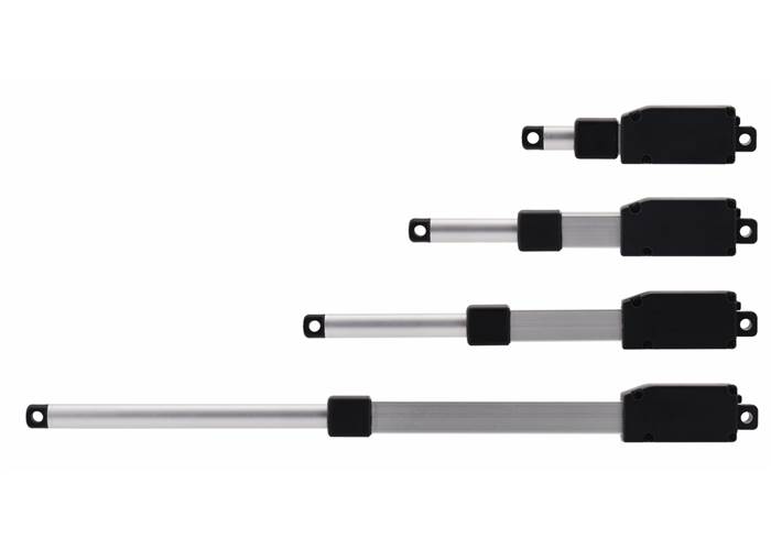 Glideforce linear actuators, from left to right: 6″ Industrial Duty (ID), 6″ Medium Duty (MD), 6″ Light Duty (LD), 50 mm Micro. |