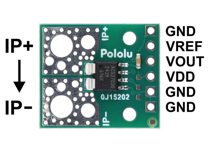 This sensor has five required connections: the input current (IP+ and IP-), logic power (VDD and GND), and the sensor output (VOUT).