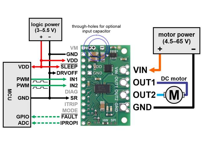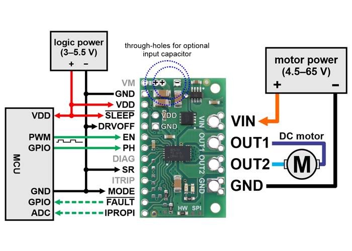 The motor and motor power (4.5 V to 65 V) connections are on one side of the board, and the control connections (3 V to 5 V logic supply) are on the other. There are two options for making the high-power connections (VIN, OUT1, OUT2, GND): large holes spaced 5 mm apart, which are compatible with the 5mm-pitch terminal blocks, and pairs of 0.1″-spaced holes that can be used with 0.1″ male headers and are compatible with perfboards, breadboards, and 0.1″ connectors. These holes are on the same 0.1″ grid as the control connections. You can also solder wires directly to the through-holes for more compact installations.