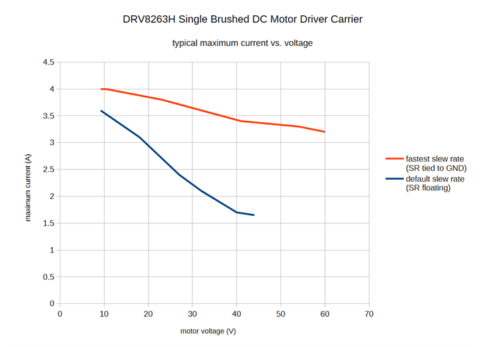 PWMing the motor will introduce additional heating proportional to the frequency, and the driver’s slew rate setting is also a factor here. For most applications, we recommend connecting the SR pin directly to ground (as shown in the minimal wiring diagrams above) to select the fastest slew rate on the DRV8263H. This graph shows the effect of the slew rate and motor voltage on the typical continuous maximum current sustainable by the driver: