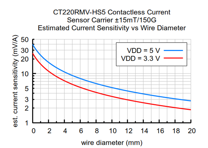 The sensor’s current range and current sensitivity depend on its distance from the conductor, along with other parameters like the conductor’s geometry and angle relative to the board. When the board is tied to a round wire as pictured below, the overall diameter of the wire (with insulation) will be the main factor, and these graphs can help you estimate the sensor’s range and sensitivity for wires of different thicknesses. However, you should calibrate the sensor in your particular setup for best results (see “Converting the sensor output into a current reading” below).