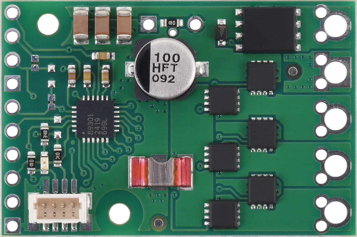 The through-holes for the control connections are also spaced with a 0.1″ pitch, and these are populated with 0.1″ male headers on the version with soldered connectors. On the version without connectors, male header pins can optionally be soldered to the other side of the board for plugging into a breadboard.