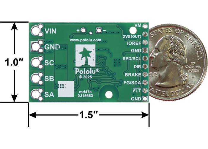 This discrete MOSFET brushless motor controller is based on Allegro’s A89301 BLDC driver and enables sensorless control of one brushless DC motor. It supports a wide 5.5 V to 48 V operating voltage range and can continuously deliver up to 11 A motor current without a heat sink or forced air. The A89301 supports four control interfaces: analog voltage, PWM duty cycle, pulse frequency, and I²C. The I²C interface also allows configuration of various settings on the A89301, and we provide a configuration utility for Windows that simplifies setup with one of our USB-to-I²C adapters. This version ships without terminal blocks or 0.1″ headers.