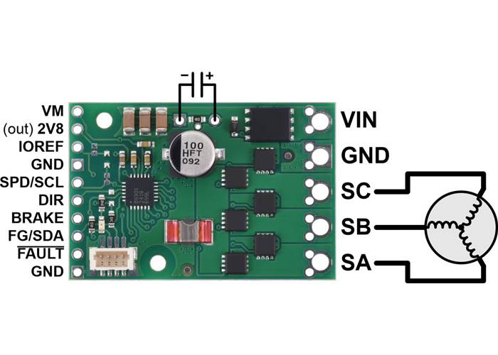 The motor and motor power connections are on one side of the board, and the control connections (2.5 V to 5 V logic) are on the other side. The motor supply should be capable of supplying high current. There are two options for making the high-power connections (VIN, GND, SA, SB, SC): large holes spaced 5 mm apart, which are populated with terminal blocks on the version with soldered connectors, and pairs of 0.1″-spaced holes that are compatible with 0.1″ perfboards and solderless breadboards and can be populated with 0.1″ male headers on the version without soldered connectors .