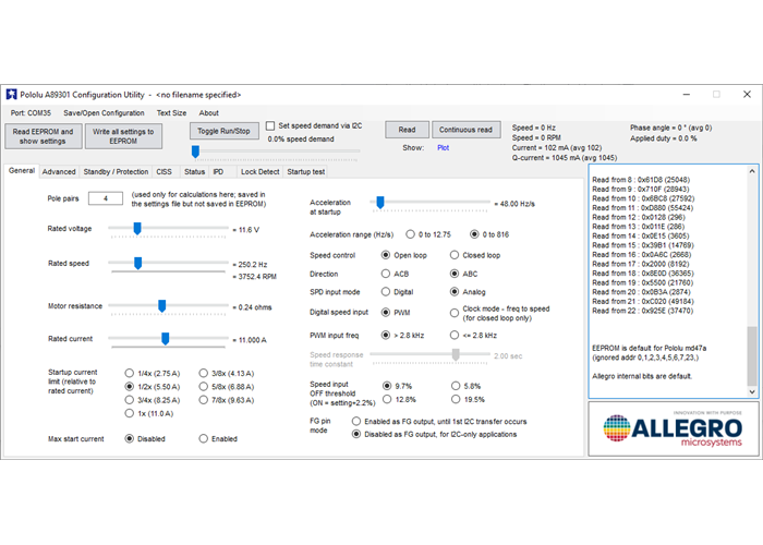 The A89301 datasheet lists most of its configuration settings, but we strongly recommend also referring to Allegro’s A89301 Evaluation Board User Guide (4MB pdf) for detailed instructions on tuning various parameters. This application note is primarily written for Allegro’s own APEK89301 evaluation board, but the information applies to our A89301-based controller board as well.