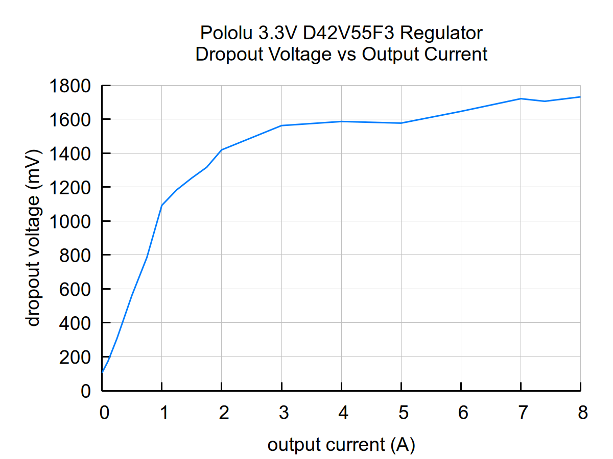 The dropout voltage of a step-down regulator is the minimum amount by which the input voltage must exceed the regulator’s target output voltage in order to ensure the target output can be achieved. For example, if a 5 V regulator has a 1 V dropout voltage, the input must be at least 6 V to ensure the output is the full 5 V. Generally speaking, the dropout voltage increases as the output current increases. The two graphs below shows the dropout voltages for this family (the 3.3 V version has its own separate graph because its dropout voltage curve is very different from the other members of this family):