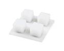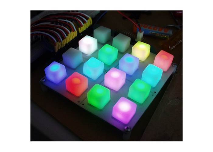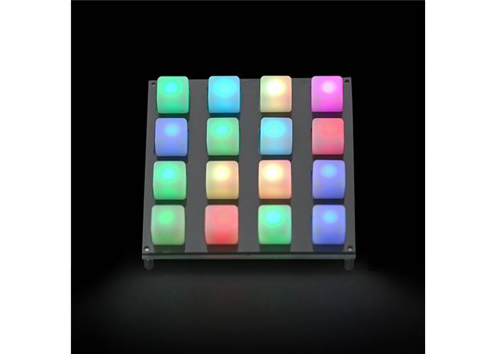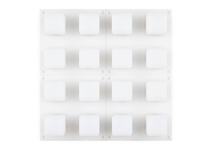 This is a translucent silicon rubber button pad with 16 buttons originally inspired by the folks at monome.org. Each button has a hole underneath that accepts either a 3mm or 5mm standard LED. The idea is that you can create a button interface of your choice with the ability to display simple colors under each button. Mainly, we wanted to use our tri-colour LEDs to create a full RGB colour for each button.