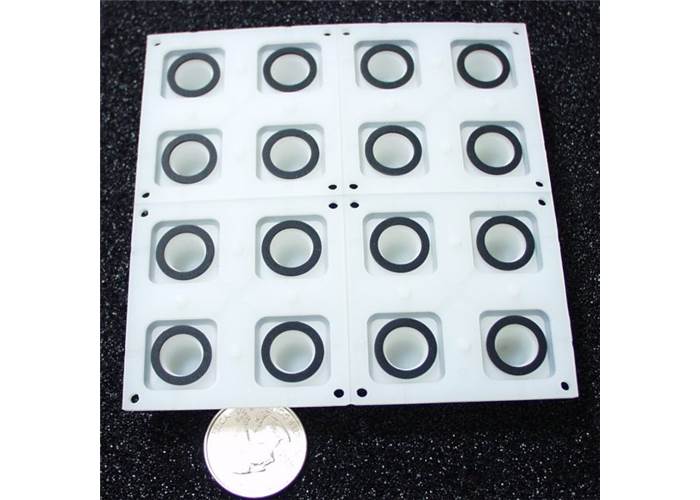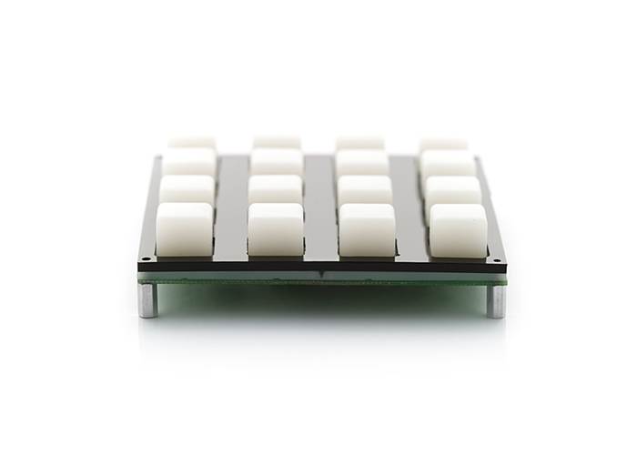 16 button pad can be split up into four, 4 button pads. Each button has a conductive circle backing so that a switch can be created with exposed PCB traces. Button force is between 190 and 210grams activation force (nice tactile feel like on your TV remote).