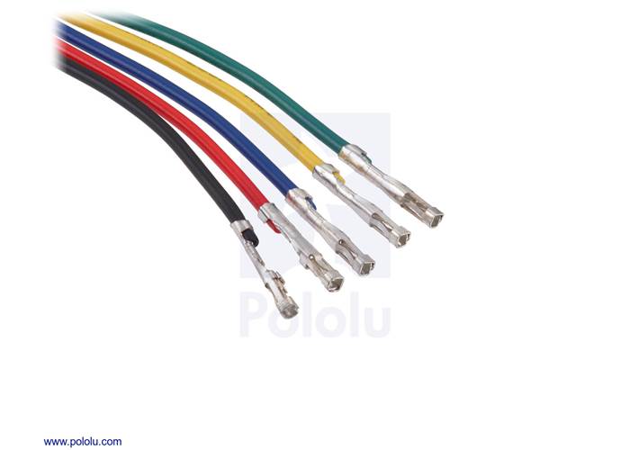 This 4-conductor, 12 cm (4.5″) cable has 24 AWG wires and a 4-pin female JST PH-type connector (2mm pitch) on one end . The other ends of the wires are terminated with female crimp pins for 0.1″ housings that are compatible with standard 0.1″ male headers.