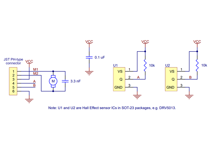 The sensors are powered through the VCC (blue wire) and GND (green wire) pins. VCC can be 2.7 V to 18 V, and the quadrature outputs A and B (yellow and white wires) are digital signals that are either driven low (0 V) by the sensors or pulled to VCC through 10 kΩ pull-up resistors, depending on the applied magnetic field. The sensors’ comparators have built-in hysteresis, which prevents spurious signals in cases where the motor stops near a transition point.