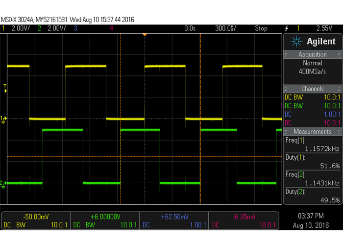 Encoder A and B outputs of a magnetic encoder on a 6V 20D mm metal gearmotor running at 6V.