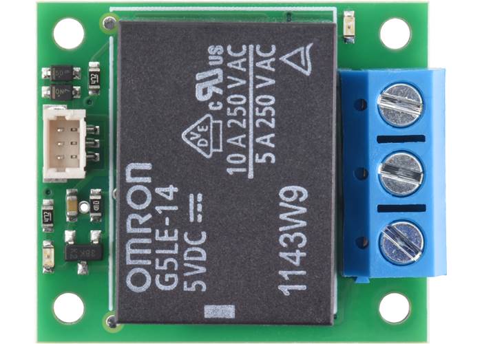 This carrier version is assembled with an Omron G5LE-14-DC5 5 V relay, which is rated for up to 10 A under most conditions, and connectors. It has a soldered 3-pin, 5mm-pitch terminal blocks for the switch connections and a top-entry, 3-pin JST SH-style connector for the control connections. This control connector works with our 3-pin JST SH-style cables (cable not included).