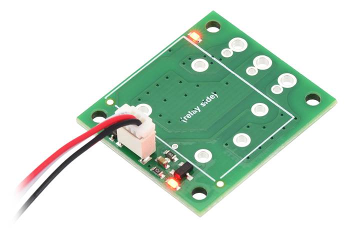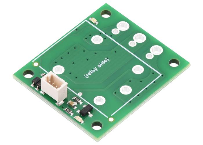 This carrier version is just the PCB assembled with all of its surface mount components, including a MOSFET for controlling the relay, indicator LEDs, a flyback diode, and a top-entry, 3-pin JST SH-style connector for the control connections. This control connector works with our 3-pin JST SH-style cables (cable not included).