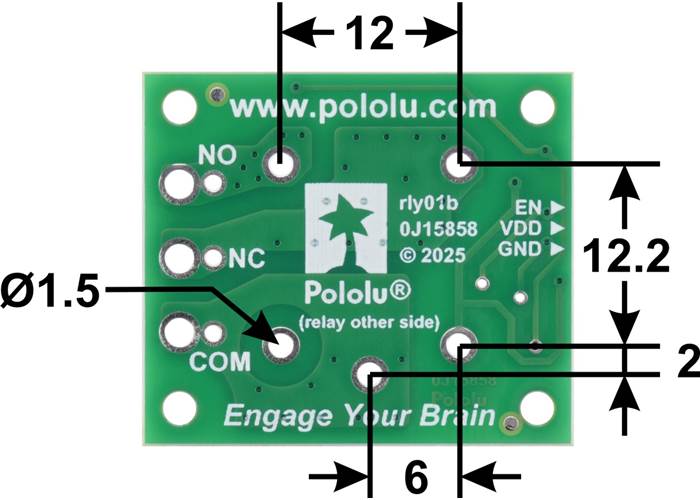 Dimensions (in mm) of “sugar cube” relay footprint on the Pololu basic SPDT relay carrier.