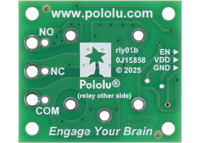 Note: This product does not include a relay or connectors for the switch pins. The board works with single-pole, double-throw (SPDT) power relays that have the common “sugar cube” pinout and footprint. Versions with relays included are also available (see the selection table near the top of this page).