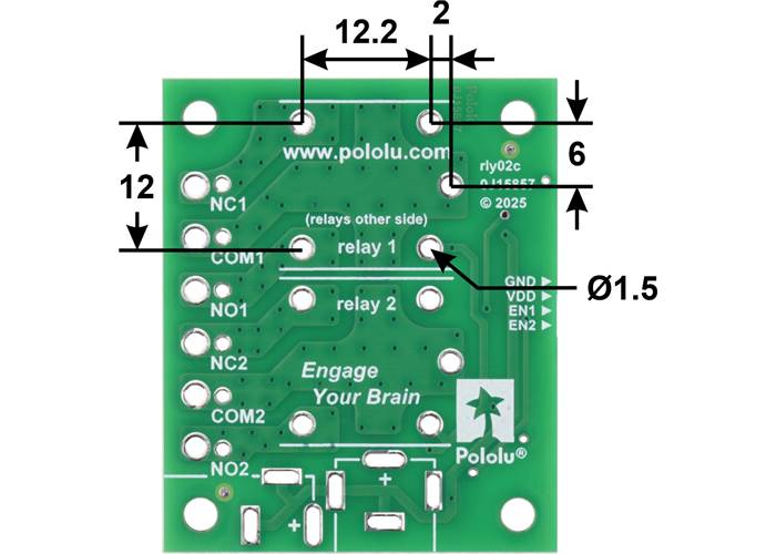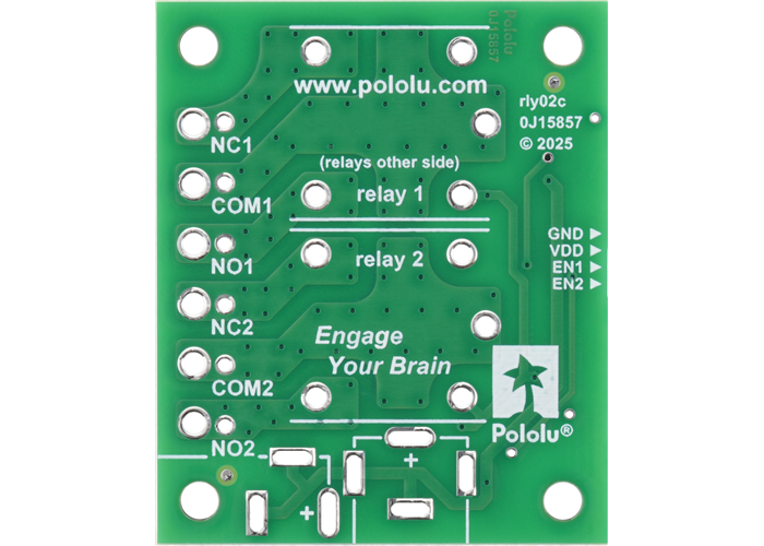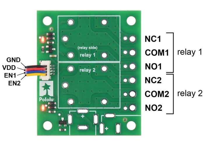 The switch portions of the relays (NCx, COMx, and NOx) are accessible on one side of the board via larger holes that work with 5mm-pitch terminal blocks or smaller holes that work with 0.2″ headers. The control pins (GND, VDD, EN1, and EN2) are routed to the 4-pin JST SH-style connector on the other side of the board. The relay coils are powered by supplying the relays’ rated coil voltage across the VDD and GND pins, and they are activated by digital high (2.5 V to 20 V) control signals on the respective EN pins. The control signals are fed directly to BSS138K N-channel MOSFETs, which in turn actuate the relay coils when the control voltages exceed approximately 2.5 V, up to a maximum of 20 V (see BSS138K datasheet (517k pdf) for details). Each relay has a corresponding red LED that lights up when the relay coil is active. The carrier board has four mounting holes that work with #4 or M3 screws.
