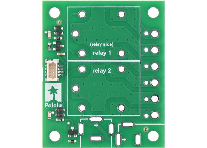 Bottom view of the Pololu Basic 2-Channel SPDT Relay Carrier for “Sugar Cube” Relays with JST SH-Style Top-Entry Connector.