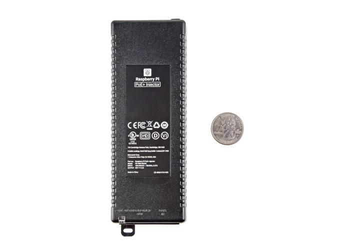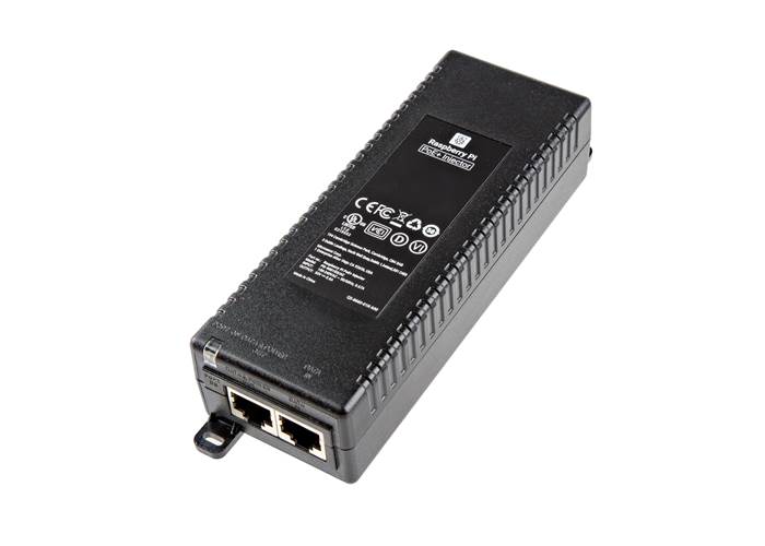A single port 30W PoE+ Injector enabling PoE supply to PoE enabled Raspberry Pi boards.