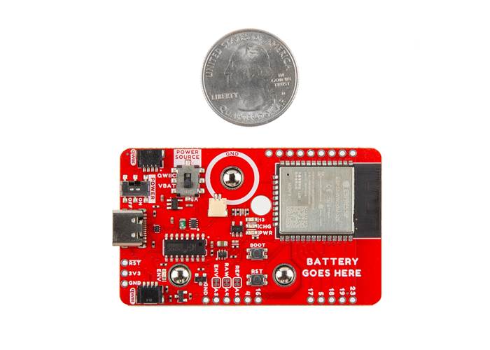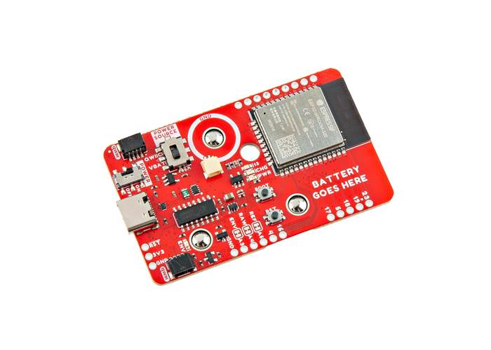 Power is regulated down to 3.3V. Users can select their power source as well as turn on/off the board with included switches. A button to manually place the ESP32 in bootloader mode is populated as well. This button can also be used as a general purpose button as well. The board is equipped with two horizontal Qwiic connectors and 2.2kΩ pull-up resistors if you decide to include additional Qwiic-enabled devices. Standard 0.1"-spaced plated through holes (PTHs) break out a few of the ESP32 module's pins on the edge of the board for users.