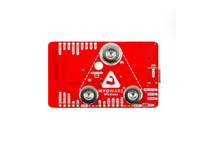 The MyoWare® 2.0 Wireless Shield is designed to take in readings from the MyoWare 2.0 Muscle Sensor and wirelessly transmit sensor data with the ESP32-WROOM! This shield also includes a built-in LiPo battery to remotely power the muscle sensor and the ESP32 module. The Wireless Shield is equipped with snap connectors and low-profile pogo pins on the board, so you can easily stack it on the top side of the MyoWare 2.0 Muscle Sensor. Simply select a Power Source and flip the power switch to the ON position to give the sensor all the power it needs to work its myoelectric magic.