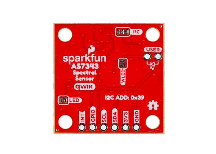The board includes a white LED to illuminate the sensing area, but also includes the option for users to install their own LED if necessary. This breakout routes the I2C signals (SDA/SCL) and power inputs (3.3V and Ground) to a pair of Qwiic connectors along with a 0.1"-spaced PTH header. The PTH header also includes the AS7343's Interrupt and programmable GPIO pins.