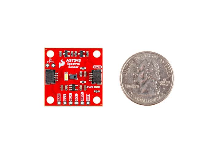 The SparkFun AS7343 Qwiic Spectral Sensor enables users to measure light in both the visible spectrum (VIS) and near-infrared (NIR) ranges, all on a single IC in a compact package. The AS7343 exhibits exceptional sensitivity across its sensing spectrum (~380nm to 1000nm) and operates reliably in low-light environments, including when measuring through tinted glass. It works well for measuring reflected, emitted, and transmitted light, making it an excellent solution for spectroscopy applications, such as colour matching, spectral signature analysis, and more. The AS7343 communicates over I2C, so naturally, we placed it on this 1 in. by 1 in. Qwiic breakout board with a pair of Qwiic connectors.