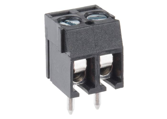 Screw Terminals with 3.5mm pitch pins. Comes in 2 or 3 positions and have the really cool feature of slide-locking together to form any size you need (4, 5, up to 20 without problems). Rated up to 125V @ 6A. Terminal can accept 30 to 20AWG wire. 3.5mm/138mil pin pitch will not fit standard 0.1" perf boards but this is the most common pitch screw terminal.