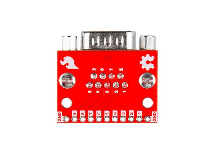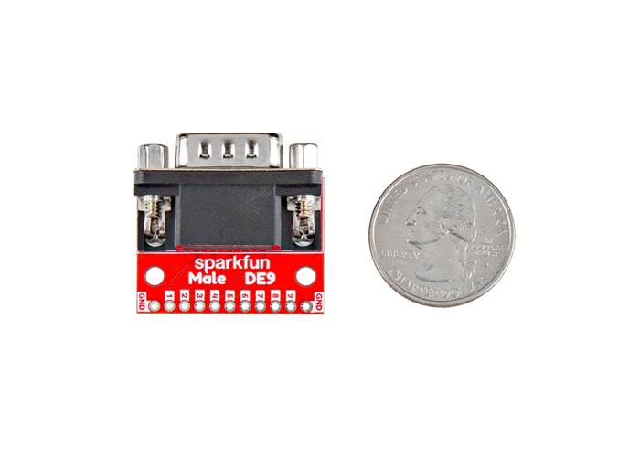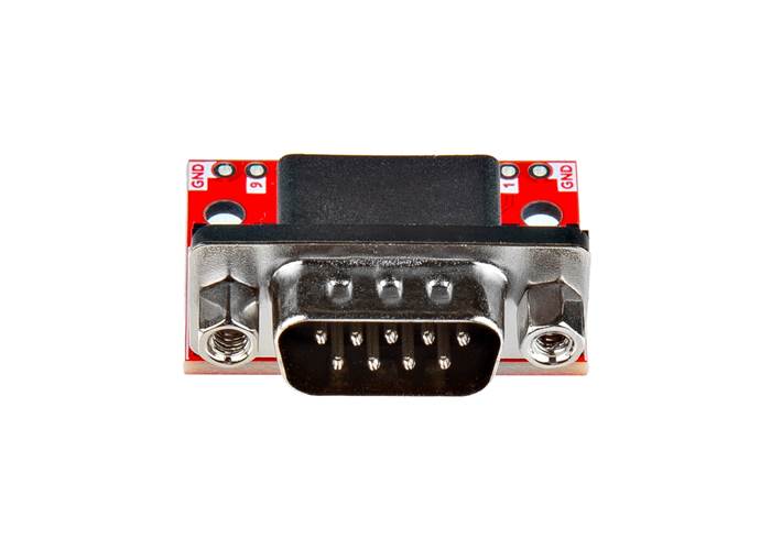 The SparkFun Male DE9 Breakout is a simple breakout board featuring a male DE9 (commonly referred to as DB9) connector. The board comes with the male DE9 connector and routes all nine of the connector's pins, along with two extra ground connections to a 0.1in.-spaced plated through-hole header.