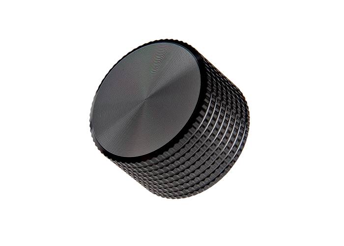 This 25mm aluminium potentiometer knob slides onto the potentiometer and has a key lock to make sure it holds tightly with a strong fit. The main body of this knob is metal with a plastic insert. The outside is knurled for precise adjustment.