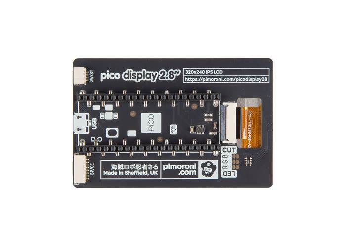 The Pico Display Pack 2.8” is a 320×240 pixel IPS LCD with an ST7789V driver and a 43.2×57.5 mm active area. It includes four tactile buttons, an RGB LED with cuttable traces for repurposing pins, a Qwiic/STEMMA QT connector for I²C devices, and an additional SP/CE connector. The board comes with pre-soldered socket headers for direct attachment to a Raspberry Pi Pico, requiring no soldering if the Pico already has header pins installed. It is compatible with Pico, Pico W, Pico 2, Pico 2 W, and Pimoroni’s Pico LiPo and Pico Plus variants. Software support is available through Pimoroni’s custom MicroPython (PicoGraphics), CircuitPython (DisplayIO), and C/C++ libraries. The board measures about 73×47×9.5 mm, with a usable screen area of 57.5×43.2 mm. The Pico is not included.