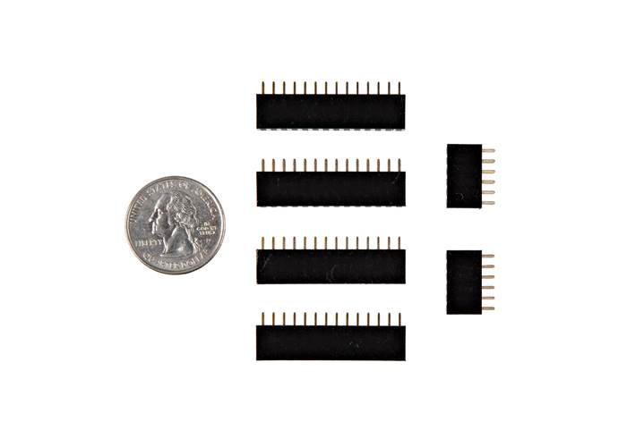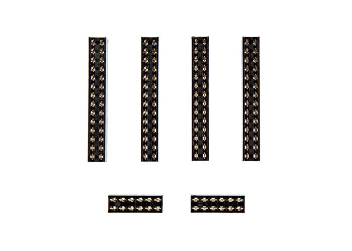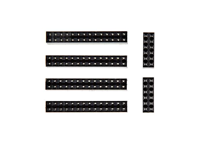 This is a set of four 2x14 and two 2x6 female headers with 0.1"-spaced pins for the Alchitry Br Wide V2 Board. These line up exactly with all the broken out holes in the Br prototyping area to make it easy to jump wires to a breadboard or other temporary connections.