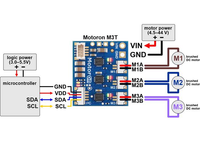 The Motoron M3T453 controllers make it easy to control three bidirectional, brushed DC motors using an I²C interface. These compact boards support motor supply voltages from 4.5 V to 44 V and can deliver output currents up to 0.8 A continuous (2 A peak) per motor. Multiple Motoron controllers can be configured to work on a single I²C bus, allowing independent control of many motors. Unlike most of our motor drivers, the Motoron does not require any PWM outputs or timers on your microcontroller. Instead, only a single I²C interface is needed regardless of how many Motorons you connect.