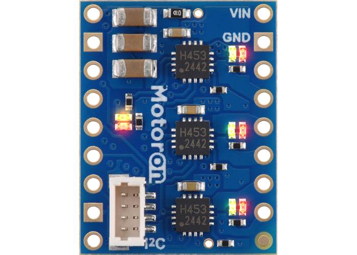 The Motoron M3T453 controllers make it easy to control three bidirectional, brushed DC motors using an I²C interface. These compact boards support motor supply voltages from 4.5 V to 44 V and can deliver output currents up to 0.8 A continuous (2 A peak) per motor. Multiple Motoron controllers can be configured to work on a single I²C bus, allowing independent control of many motors. Unlike most of our motor drivers, the Motoron does not require any PWM outputs or timers on your microcontroller. Instead, only a single I²C interface is needed regardless of how many Motorons you connect.