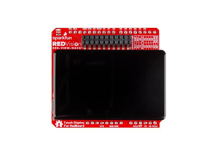 The Red Vision Touch Display for RedBoard features a 2.0", 320x240px capacitive touch LCD mounted on a breakout board designed to plug directly into the RP2350 RedBoard IoT. The display board includes a connector that plugs into the SparkFun Red Vision Camera Board - HM01B0 (Colour) or other 2x9-pin camera boards.