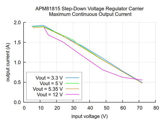 The APM81815 is a synchronous buck (step-down) voltage regulator that generates lower voltages from input voltages as high as 72 V (80 V absolute maximum). They are switching regulators (also called switched-mode power supplies (SMPS) or DC-to-DC converters), which makes them much more efficient than linear voltage regulators, especially when the difference between the input and output voltage is large. On our boards at room temperature and with no additional heat sinking or airflow, these regulators can typically support continuous output currents between 0.5 A and 1.5 A, depending on the input voltage and output voltage (see the Maximum continuous output current section below). In general, the available output current decreases as the input voltage increases.