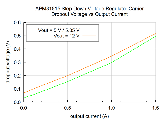 Typical dropout voltage of the APM81815 Step-Down Voltage Regulator Carrier (5V output versions and above).