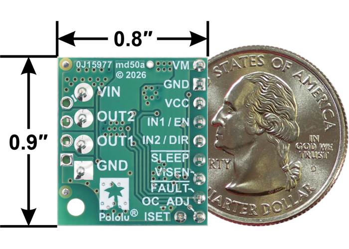 MPQ6612A Single Brushed DC Motor Driver Carrier (Soldered Connectors), bottom view with dimensions and a US quarter for size reference.