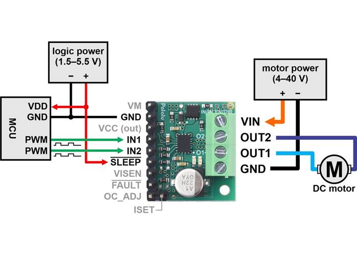 Aside from motor and power connections (including a logic voltage connection to SLEEP), the only required control pins are IN1 and IN2. The following simplified truth table shows how these two control pins affect the driver outputs: