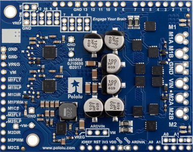 The versatility of this driver makes it suitable for a large range of currents and voltages, with the ability to deliver up to around 30 A of continuous current without heat sinking or forced airflow. The module offers a simple interface that requires as few as two I/O lines while still allowing for your choice of sign-magnitude or locked-antiphase operation. An on-board current sensor gives a direct measurement of the motor current, and the driver can limit the motor current to a configurable threshold. The power supply inputs feature reverse-voltage protection, while integrated detection of various fault conditions helps protect against other common causes of catastrophic failure; however, please note that the board does not include over-temperature protection.