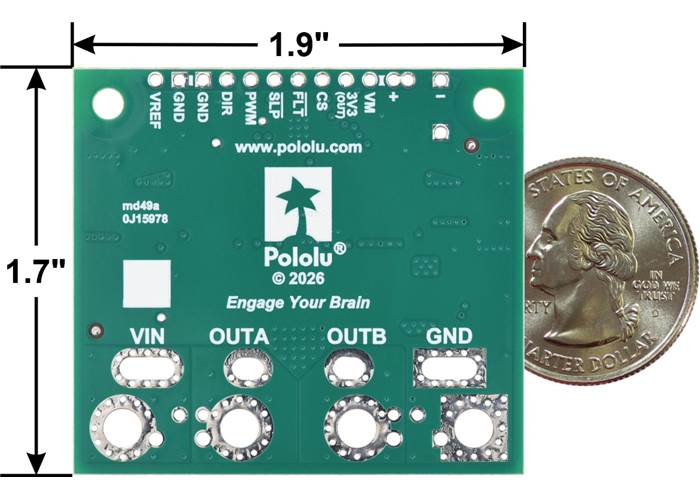 Pololu G2 High-Power Motor Driver 24v30 CS, bottom view with dimensions and a US quarter for size reference.