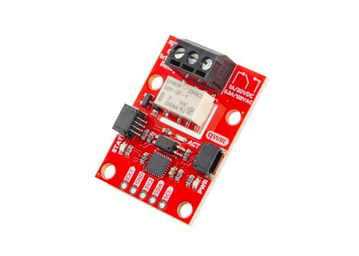 Easily control high-power devices directly from your microcontroller via I2C with the SparkFun Qwiic Relay. Built around the Omron G6K-2F-Y DC3 dual-pole/dual-throw (DPDT) relay, this board allows you to safely switch loads up to 1A at 30VDC or 0.3A at 125VAC (at 40°C). This relay is perfect if you're controlling heavy-duty motors or managing other high-power devices, bridging the gap between low-voltage logic and high-power applications.