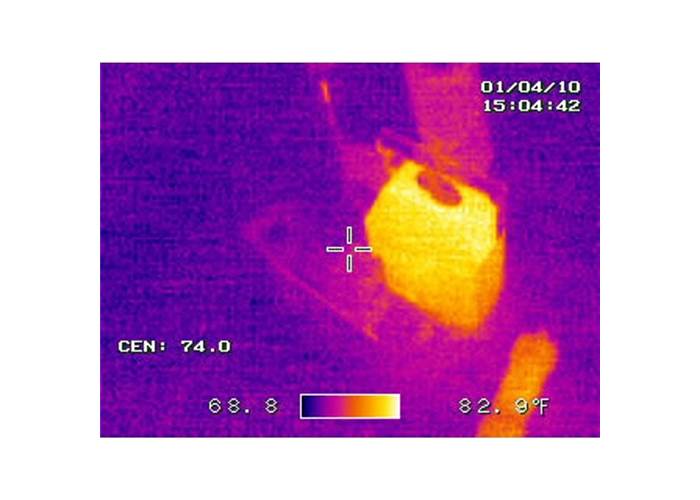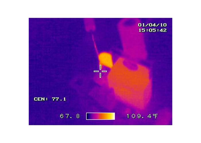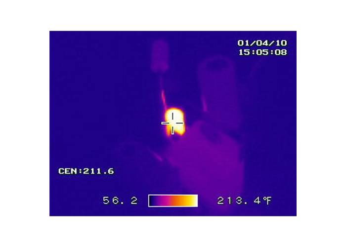 The thermal pictures to the right do a great job of showing what happens when the PTC is tripped. The first thermal picture shows a voltage regulating circuit in its normal state. In the second picture the circuit is shorted, notice how hot the PTC gets (213 °F!) as it limits the amount of damaging current going through the circuit. Major thanks to Joshua Weaver for the great thermal shots!