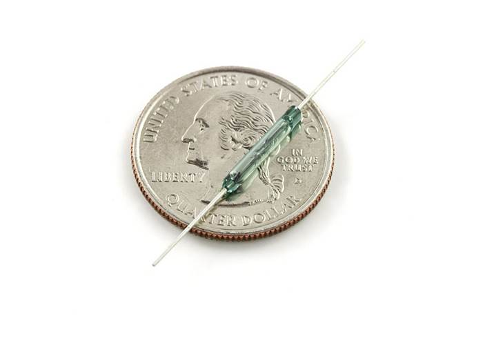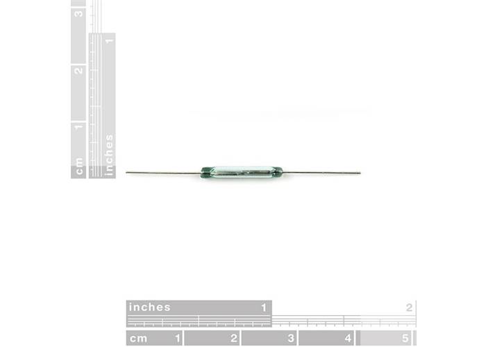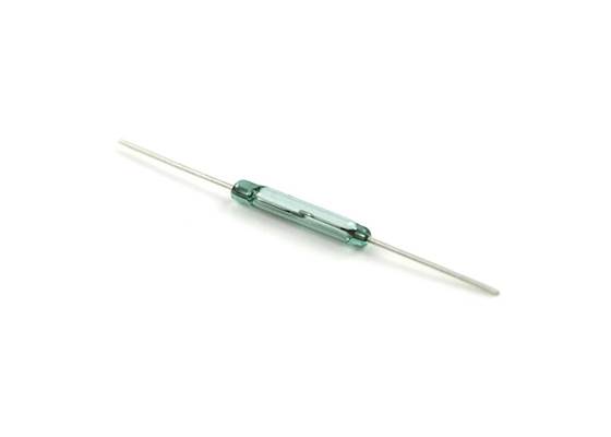 This is a small device called a reed switch. When the device is exposed to a magnetic field, the two ferrous materials inside the switch pull together and the switch closes. When the magnetic field is removed, the reeds separate and the switch opens. This makes for a great non-contact switch. This switch can carry up to 1.2A.